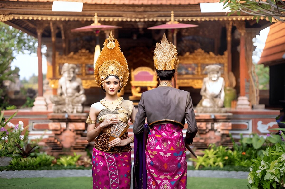 Bali, like other regions, has various traditional attires for different occasions, but Payas Agung stands out as the most luxurious. Worn during weddings or tooth-filing ceremonies, Payas Agung signifies luxury and special occasions. The outfit of bride has a high crown along with colorful fabric and also a long wrap called tapih from chest to toes, layered with kemben and kamen prada extending to the ankles. The bride also wears a srinata, an amazing forehead decoration, and a crown decorated with sandats and gold flowers. Accessories includes- shoulder bracelet and a waist belt. This attire is reserved for significant cultural and ceremonial events, showcasing Bali’s rich cultural heritage.