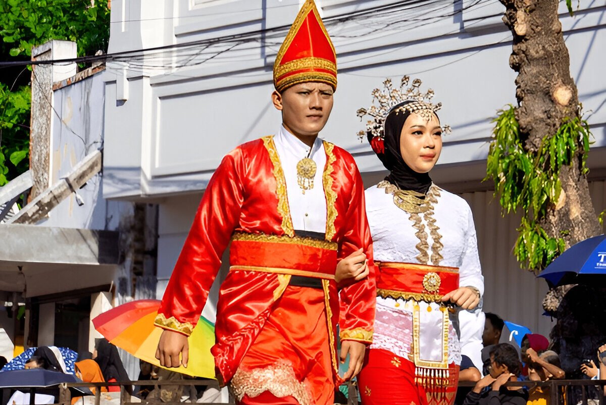 The Bugis and Toraja tribes of South Sulawesi wear distinct traditional attire that marks significant aspects of their heritage and social hierarchy. Baju Bodo, a traditional garment of the Bugis tribe, is among the oldest in Indonesia. Its loose, shortsleeved structure comes in various colors that represent age and social status: green for nobility, white for shamans, purple for widows, and orange and red for young women. Often paired with checkered sarongs and goldplated jewelry, Baju Bodo stands as a vibrant representation of Bugis culture.