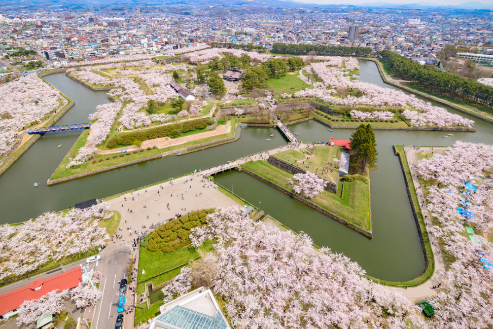 - Aerial views of cherry blossoms surrounding the star-shaped fort